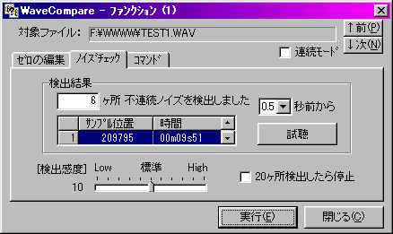 ファンクション 「ノイズチェック」 で、不連続ノイズ(通称プチノイズ、スクラッチノイズ等)を検出することもできます。