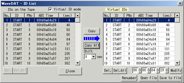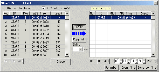 仮想IDリストへの登録は、これまで同様に通常のIDモードでサーチや再生/録音で取得したテープ上の実IDをコピーすること(IDリスト中央の