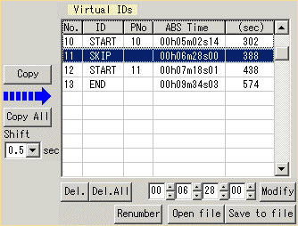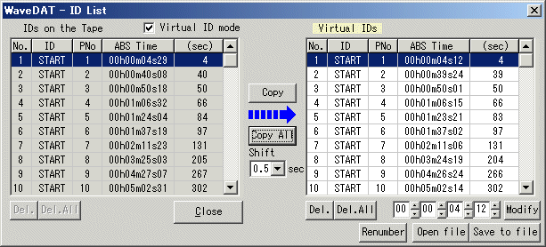 ※実IDのIDリストの場合と同じく、テープ走行中でもIDリストを表示したままにすることができ、再生時のID通過や録音時のID書き込みに追従して、選択行が移動するようになっています。